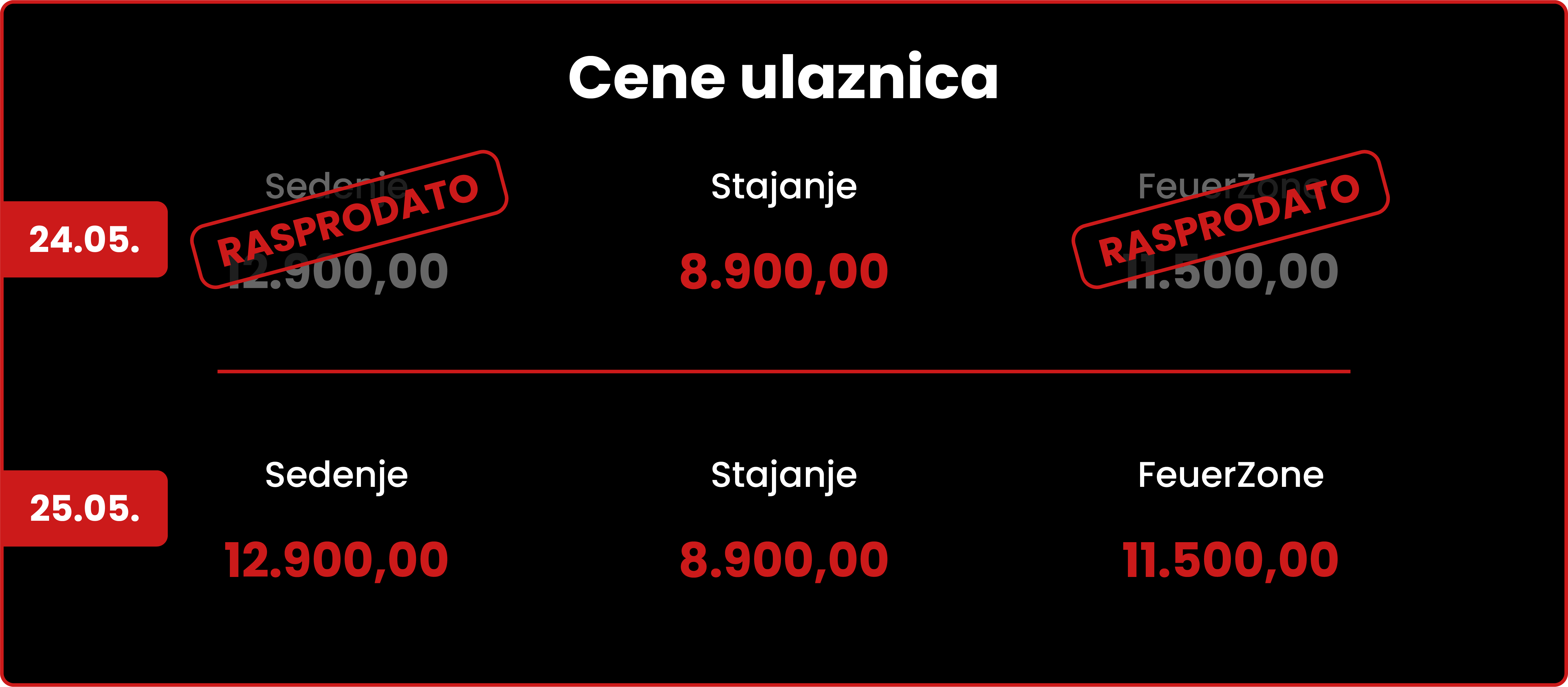 Kupovina i korišćenje ulaznica za koncert, kao i učešće na događaju koji je zakazan u Ušće Park-u u Beogradu, podrazumeva saglasnost sa propisima Organizatora za prisustvo na događaju.